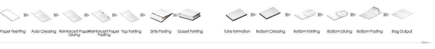 The basic working flow is sheet feeding, creasing, servo top reinforced card taking and pasting, top folding (insert pasting), tube forming, gusset forming, bottom open and gluing, bottom folding and closing, compaction and output.